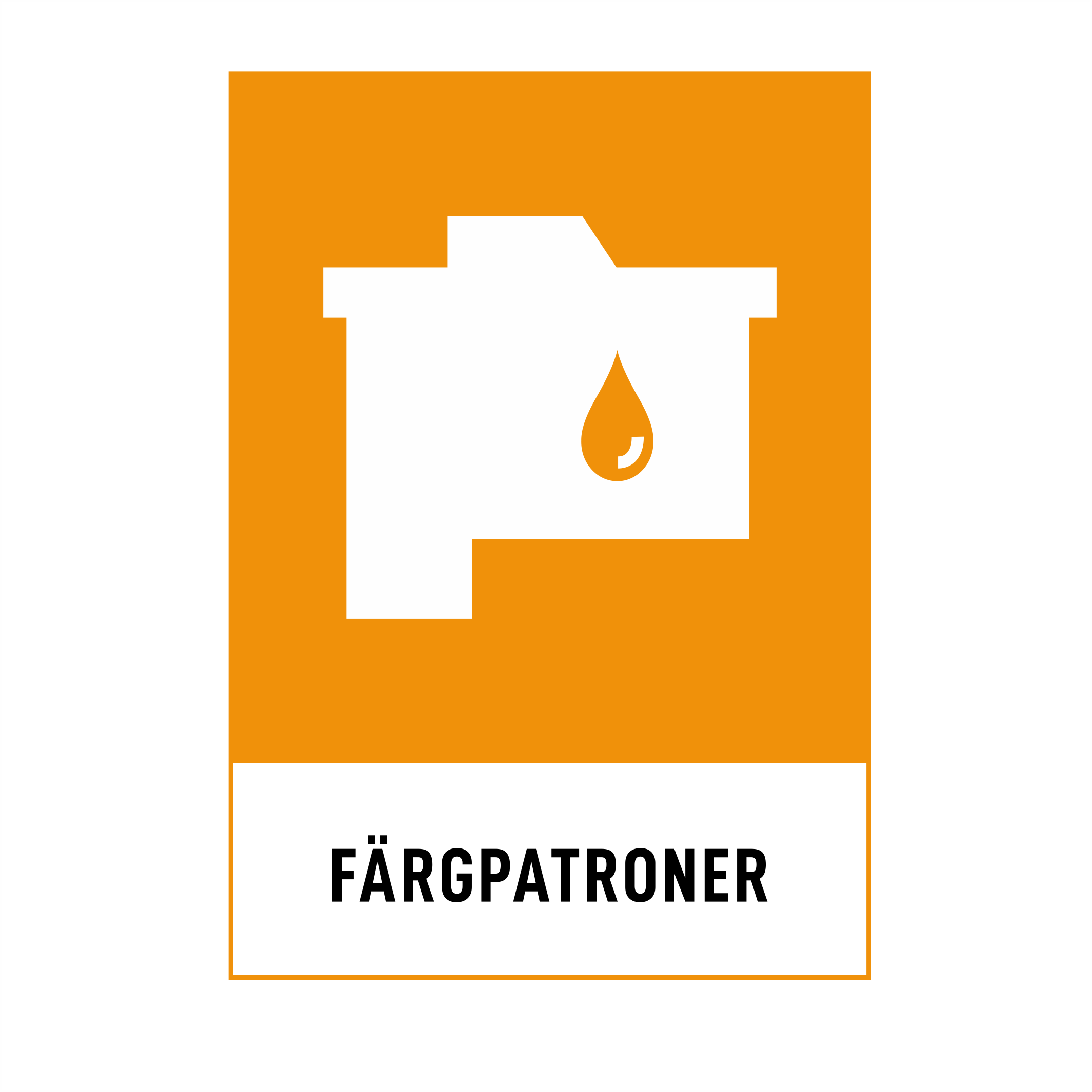 Dekal, skylt med piktogram, "Färgpatroner". Formen och färgerna enligt Avfall Sveriges standard om dekaler och skyltar för hushållsnära insamling och återvinningscentraler